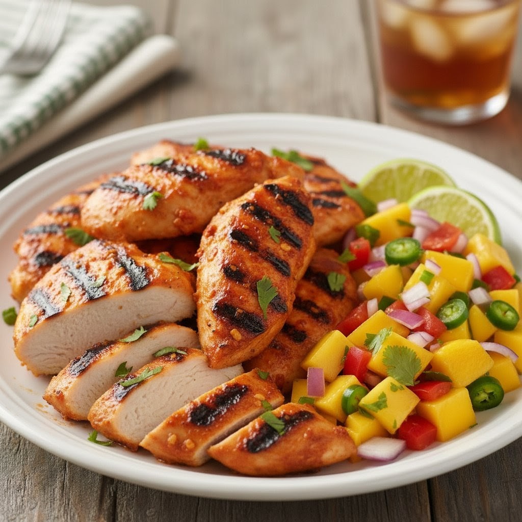 3. Servieren: Das Hähnchen in Scheiben schneiden und mit der Mango-Salsa anrichten. Nach Wunsch mit frischem Koriander garnieren.